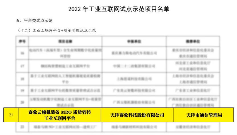 近日,工業(yè)和信息化部公布2022年工業(yè)互聯(lián)網(wǎng)試點(diǎn)示范項(xiàng)目名單,經(jīng)過(guò)自主申報(bào)、地方推薦、專家評(píng)審和網(wǎng)上公示,天津賽象科技股份有限公司的“賽象云橡機(jī)裝備MRO質(zhì)量管控工業(yè)互聯(lián)網(wǎng)平臺(tái)”成功入選平臺(tái)類試點(diǎn)示范項(xiàng)目。
