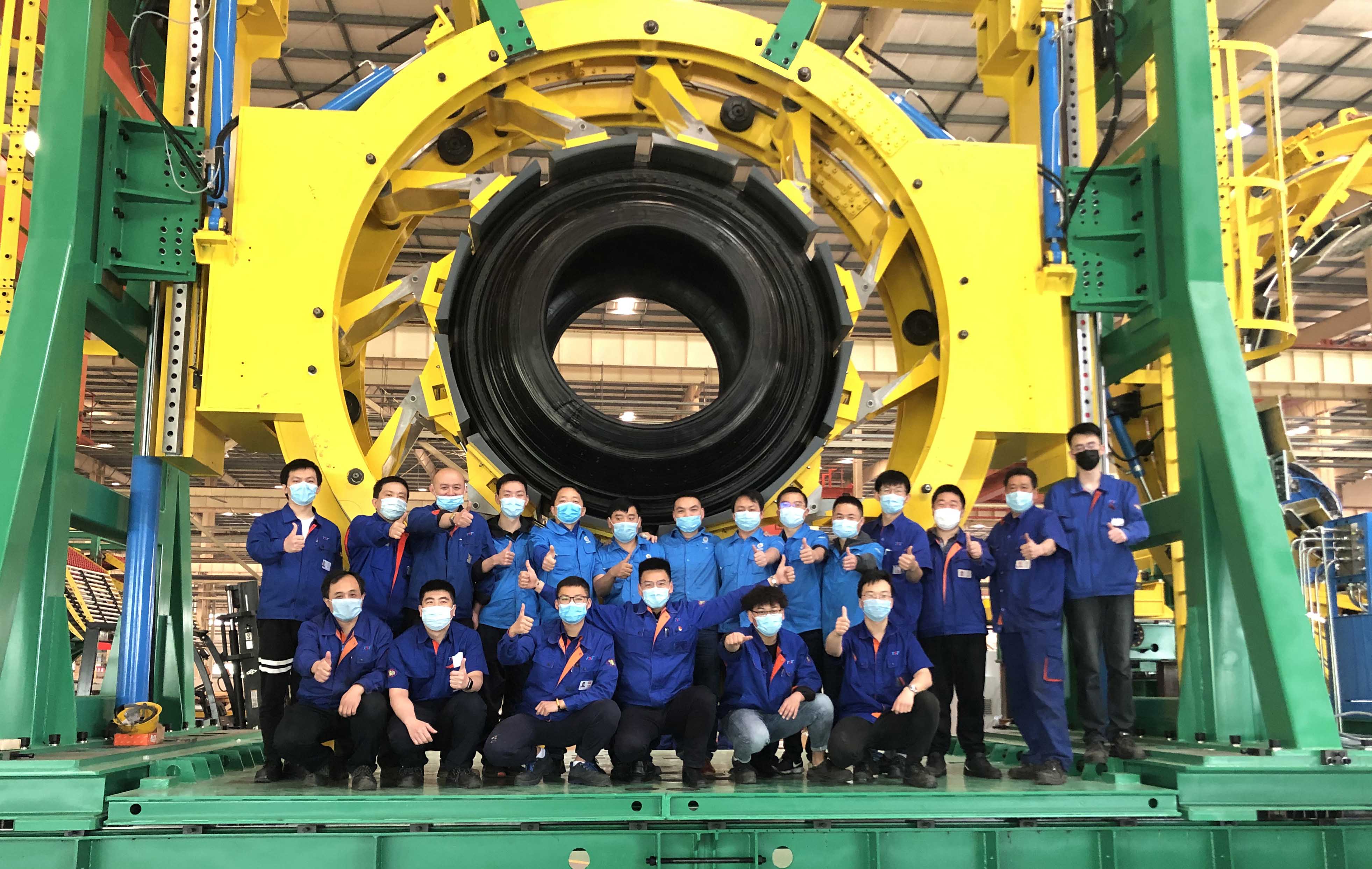 5月9日,立夏節(jié)氣已過,氣溫節(jié)節(jié)攀高,伴著溫度一起上升的,還有賽象科技三期總裝車間里設(shè)備安裝調(diào)試團隊的熱情,縱使一場大雨不期而至,也沒有澆滅他們工作的勁頭,終于,車間內(nèi)爆發(fā)出一陣響亮的歡呼聲和掌聲,由賽象科技為國內(nèi)某知名輪胎公司研制的巨型工程子午輪胎成型裝備試車成功,客戶公司參與設(shè)備調(diào)試人員和公司安裝調(diào)試團隊紛紛與設(shè)備集體合影留念,來紀念這一重要的時刻。